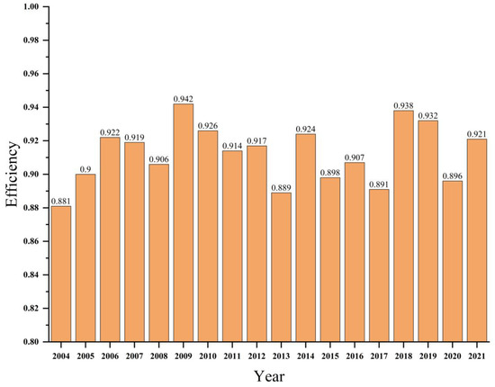 Average eco-efficiency of indica rice in China from 2004 to 2021.