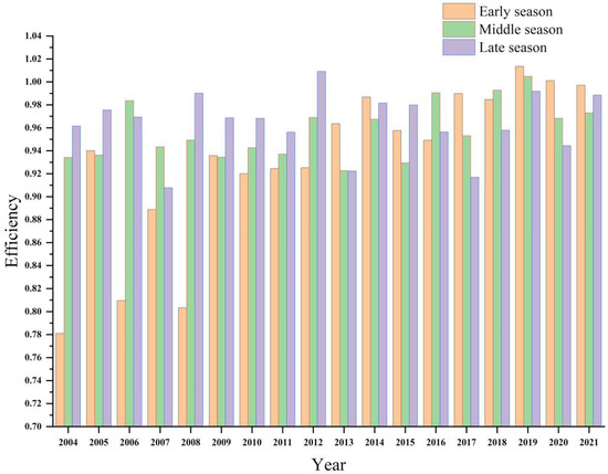 The efficiency scores derived from the super-efficiency SBM model for the three-crop indica rice—early, medium, and late indica—over the period from 2004 to 2021 provide a detailed look into their respective production patterns and how they interact with the larger agricultural and socio-political environment in China (Figure 3).