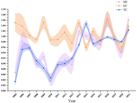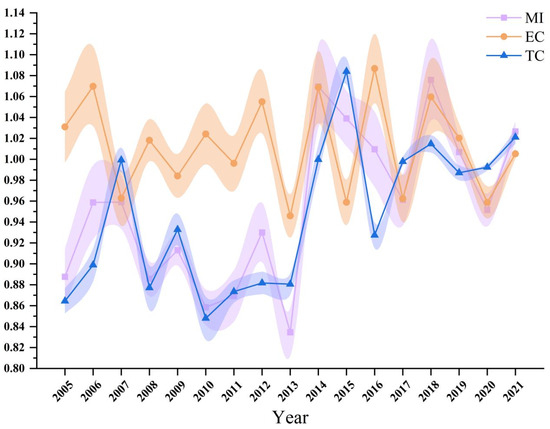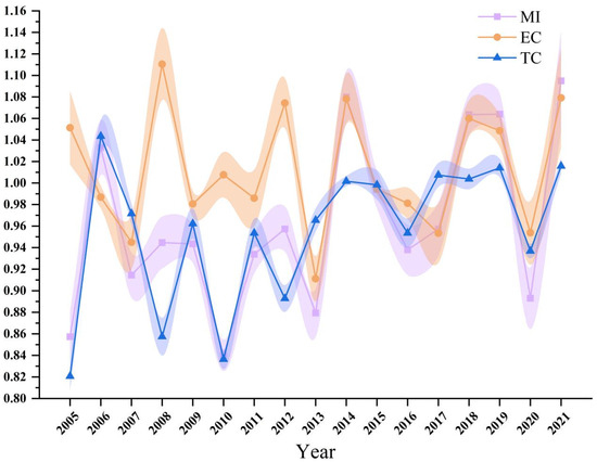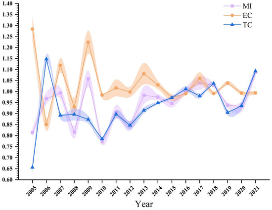 In the subsequent 2005–2006 period, there was a remarkable surge in TC to 1.148, while EC declined considerably to 0.851. Driven by this pronounced increment in TC, MI saw a significant augmentation at 0.968. As we move into the 2006–2007 interval, TC experienced a marked reduction to 0.892, whereas EC rose to 1.119. Despite the attainment of a certain level of technical progress, its influence on MI remained palpable. The MI did not depict a decline during this phase; contrarily, it marginally advanced to 0.994. Following this, the trend variations between MI and EC became relatively synchronous. Starting from 2009–2010, the fluctuation trends and even the index levels of MI and TC mirrored each other quite closely.