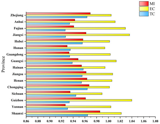 Malmquist Index (MI), Technical Efficiency Change (EC), and Technical Change (TC) for Indica Rice Production across 16 Provinces.