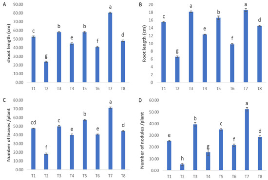 Effect of NPs of ZnO, CuO, and ZnO-CuO on (A) shoot length, (B) root length, (C) number of leaves and (D) number of nodules of F. oxysporum wilt disease of faba bean plant. T1: healthy control; T2: infected control; T3: healthy and treated with ZnO NPs; T4: infected and treated with ZnO NPs; T5: healthy and treated with CuO NPs; T6: infected and treated with CuO NPs; T7: healthy and treated with ZnO-CuO NPs; T8: infected and treated with ZnO-CuO NPs. (Data represent mean ± SD, n = 3, letters “a–h” refer to significance in statically analysis).