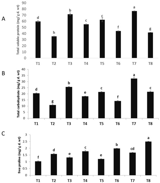 The lengths of the shoots were measured at random from above the soil surface to the end of the plant’s growing tip and recorded in cm. Root lengths were measured from the soil surface to the end of the root tip and recorded in cm. Chlorophyll and carotenoids were measured using the technique of Abdelaziz et al. [20]. A solution consisting of 50 mL of acetone with an 80% concentration was employed to extract photosynthetic pigments from a sample of fresh leaves weighing 0.5 g. The filtrate was subsequently quantified by spectrophotometric analysis at wavelengths of 665 nm, 649 nm, and 470 nm. The estimation of the soluble protein was conducted by Lowry et al. [21]. A volume of 1 mL of the extract was mixed with 5 mL of an alkaline reagent consisting of 50 mL of a 2% Na2CO3 solution prepared in 0.1 N NaOH and 1 mL of a 0.5% CuSO4 solution prepared in 1% potassium sodium tartrate. Additionally, 0.5 mL of Folin’s reagent, diluted by a ratio of 1:3 v/v, was added to the mixture. After a duration of 30 min, an observable alteration in color was detected at a wavelength of 750 nanometers.