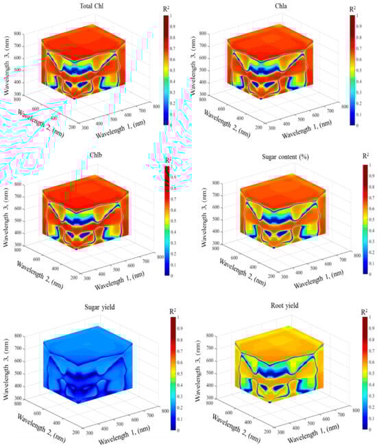 The spectral reflectance of the sugar beet canopy was measured at 145 days after sowing using a spectroradiometer device (Handy Spec Field®, tec5, Oberursel, Germany) with a 12° field of view. To achieve a wider scanning area, the device’s detector was mounted at a fixed height of approximately 1.0 m above the ground. The device has the ability to capture the spectra reflected from the canopy at wavelengths ranging from 302 nm to 1048 nm. During cloud-free days at 11:30 to 13:30 GMT, we obtained the spectral reflectance data from the sugar beet canopy under sunlight. To calibrate the sensor’s spectral reflectance, we used a white polytetrafluoroethylene Spectralon. The processed spectra were then used to derive the various SRIs. Table 1 lists some of the most widely used SRIs, along with their formulas and relevant references. There were 18 SRIs extracted from the spectral data, including 6 widely published SRIs and 12 newly constructed three-band (3D) SRIs (Table 2). The statistics were displayed on contour maps as the determination coefficients (R2) between the different parameters (Chlt, Chla, Chlb, RY, SY, and SC) and the 3D-SRIs (Figure 1). These indices were calculated by integrating potentials from a spectrum region ranging from 390 to 750 nm at any three wavelengths. Three-dimensional spectral reflectance maps were created because they are essential for selecting the optimal spectral region with practical wavelengths and for understanding the significance of the 3D-SRIs [70].
