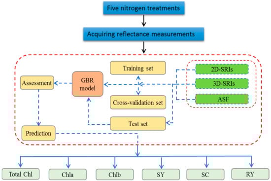 A post hoc test (Tukey’s test) at a 0.05 level of probability was used to examine significant differences between the mean values of the measured traits and SRIs under different nitrogen levels. Mean values with the same letter did not differ significantly at p ≤ 0.05. We used simple regression to estimate the relationships between the SRIs and sugar beet parameters. The significance level of R2 for these relationships was assessed at p ≤ 0.001, 0.01, and 0.05. The performance of the GBR based on the 2D-SRIs, 3D-SRIs, and ASRIs was evaluated by comparing the values of R2 and RMSE. A lower RMSE and higher R2 indicate better accuracy of the different models.