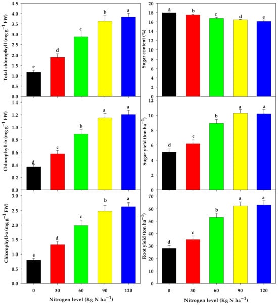 Response of chlorophyll-a, chlorophyll-b, total chlorophyll, root yield, sugar yield, and sugar content to different nitrogen levels. Bars followed by the same letter do not differ statistically according to Tukey’s test at p = 0.05.