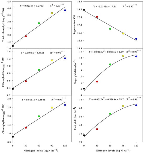 Functional relationships between nitrogen levels and different sugar beet parameters. *** indicates significant at p < 0.001.