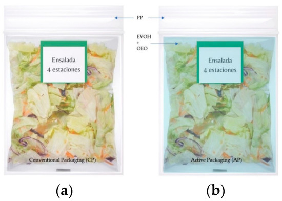 In this study, the packaging analyzed was used to pack a salad mix (containing grated carrot, iceberg lettuce, and red cabbage). For the conventional packaging (CP), the packaging material used was PP film. The active packaging (AP) was prepared by coating the same polypropylene (PP) film with ethylene vinyl alcohol copolymer (EVOH) incorporated with oregano essential oil (OEO) (Figure 1).
