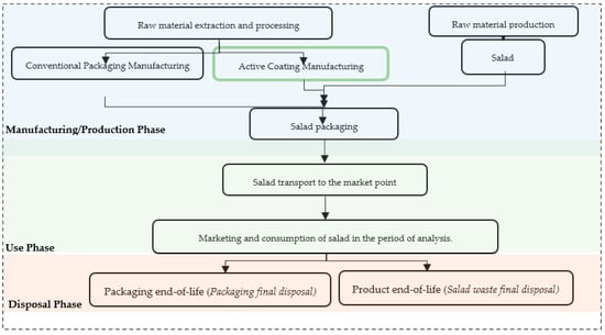 The system boundaries included the production of the package, its end of life, the production of the salad, and the transport of the materials to the packaging and sales points, as shown in Figure 2. The production and coating application process only took place if the EVOH coating was introduced. All the other stages were the same for the two analyzed systems, except the reference flows, which are different because they depend on the quantity produced. Thus, a common reference time was assumed for the two packaging systems.