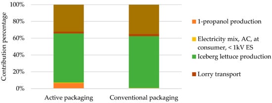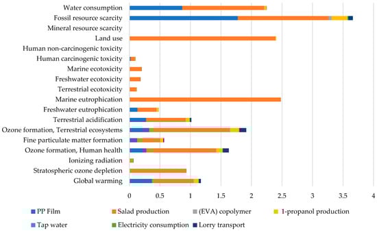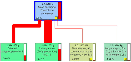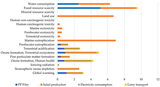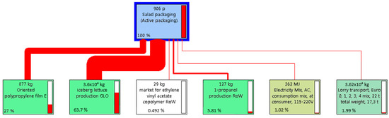 Figure 3 shows the global impact of salad packaging with the two packaging options considering all impact categories of the ReciPe Midpoint (H) method. The most significant impact is attributed to the production of the salad. However, it is possible to appreciate that by using AP, the salad production process proportion is lowered than it is with the use of CP; this is because by increasing the shelf life of the salad in AP, less salad has to be produced to obtain the same amount of product at the point of sale in the period analyzed (70 days).