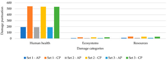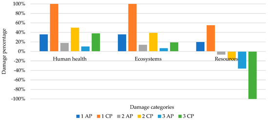 A comparison of the final disposal scenarios for the two alternatives (CP and AP) was performed with the damage categories; these categories consider their cumulative impact and reflect the damage caused to human health, ecosystems, and resources. The results showed that the AP performed better in all scenarios analyzed, as its scores had significantly lower values.