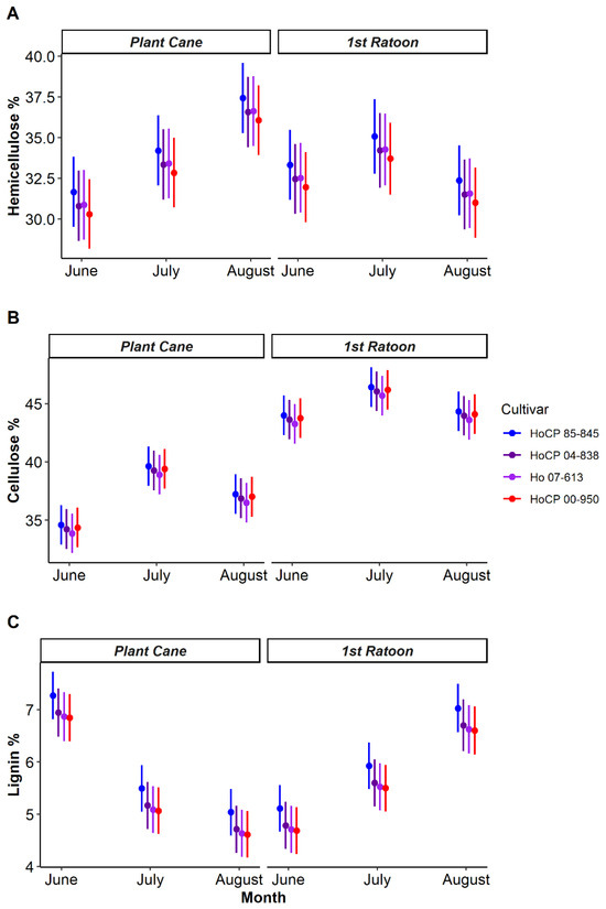 Lignocellulosic components—(A) hemicellulose (%), (B) cellulose, and (C) lignin (%)—for each month of sampling during the growing season per cultivar and crop year. Center points indicate the associated general linear mixed-model-predicted means with bars indicating standard errors; cultivars indicated by color.