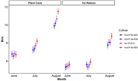 Brix readings for each month of sampling during the growing season per cultivar and crop year. Center points indicate the associated general linear mixed-model-predicted means with bars indicating standard errors; cultivars indicated by color.
