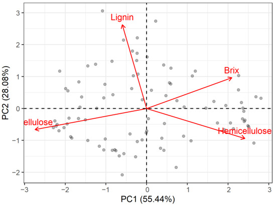 Biplot for the principal component analysis of lignocellulosic composition (hemicellulose, cellulose, and lignin) and Brix content collected throughout each growing season, with variables indicated by red arrows and labels and individual samples indicated by points.