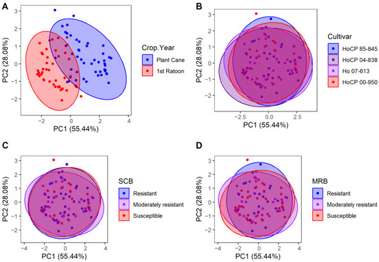Principal component analysis of lignocellulosic composition (hemicellulose, cellulose, and lignin) and Brix content collected throughout each growing season grouped by (A) crop year, (B) cultivar, (C) sugarcane borer (SCB) resistance classification, and (D) Mexican rice borer (MRB) resistance classification. Points represent individual sample coordinates; groupings are indicated by ellipses and color.