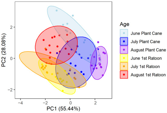 Principal components analysis of lignocellulosic composition (hemicellulose, cellulose, and lignin) and Brix content collected throughout each growing season grouped by a combination (age) of collection month and crop year. Points represent individual sample coordinates; groupings are indicated by ellipses and color. Lighter tones indicate earlier in the growing season, cool tones indicate plant cane, and warm tones indicate 1st ratoon.