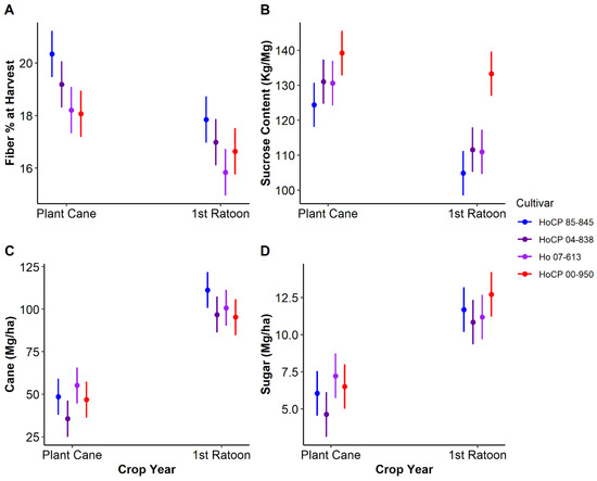 Harvest metrics—(A) fiber (%) content, (B) sucrose content (kg·Mg−1), (C) cane biomass (Mg·ha−1), and (D) sugar yield (Mg·ha−1)—per cultivar and crop year. Center points indicate the associated model-predicted means with bars indicating standard errors; cultivars indicated by color.