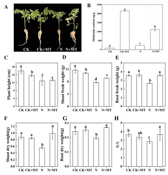 Compared with CK, NaHCO3 treatment (N) had a significant inhibitory effect on the growth of tomato seedlings, as evidenced by a smaller crown size (Figure 1A) and a significant reduction in the plant height, root–crown ratio, and dry and fresh weights of above-ground and below-ground parts, whereas foliar spraying of exogenous MT (N + MT) alleviated the inhibitory effect of NaHCO3 stress on the growth of tomato seedlings (Figure 1C–H).