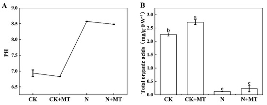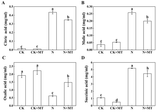 Total organic acid contents were substantially reduced by 96% and 92% in N and N + MT compared with CK and CK + MT groups, respectively (Figure 2B). The organic acid content increased by 50% in the N + MT group compared with that in the N group. This indicated that MT reduced the root pH by increasing the secretion and synthesis of organic acids in the root system, thereby alleviating the effect of alkali stress in tomato.