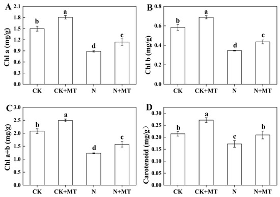 Chl a, Chl b, total chlorophyll, and carotenoid contents were significantly increased by 20.45%, 17.76%, 19.70%, and 26.62%, respectively, in the CK + MT group compared with the CK group (Figure 4). They were reduced by 40.90%, 40.38%, 40.89%, and 19.74%, respectively, in the N group compared with the CK group. This indicated that NaHCO3 stress resulted in a reduced content of photosynthetic pigments in the leaves of tomato seedlings. The N + MT treatment significantly increased the contents of Chl a, Chl b, carotenoids, and total chlorophyll by 28.44%, 25.90%, 21.69%, and 27.73%, respectively, compared with the N treatment. This indicated that MT application maintained high photosynthetic pigment content under alkali stress.