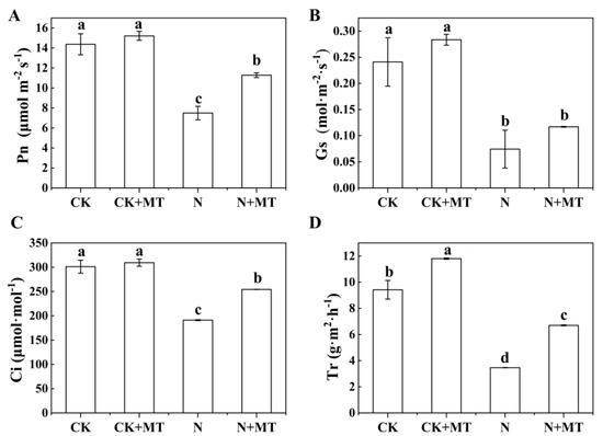 In the N group, photosynthesis in the leaves of tomato seedlings was decreased, as reflected by the significant decrease in Pn, Gs, Ci, and Tr by 54.65%, 47.88%, 106%, and 63.23%, respectively, compared with the CK group. Compared with the N treatment, the N + MT treatment alleviated the effects of alkali stress on the above parameters to varying degrees; Pn, Gs, Ci, and Tr were significantly increased by 50.55%, 57.49%, 33.14%, and 93.4%, respectively (Figure 5). This indicated that MT application could alleviate the unfavorable effects of NaHCO3 stress on the photosynthesis in the leaves of tomato seedlings.