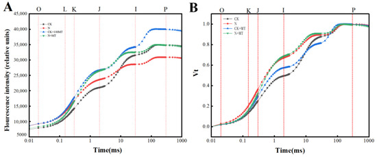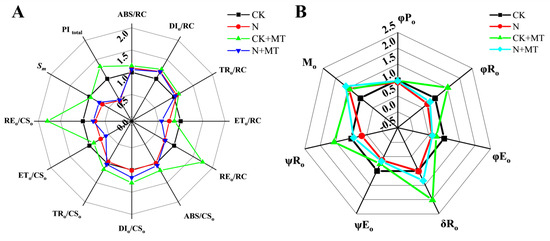 Figure 6A shows the OJIP curves between the O-phase (Fo) and the P-phase (Fo) under various treatments. Compared with the CK treatment, the amplitude of I–P of the OJIP curves under the CK + MT treatment gradually increased, particularly at the highest amplitude of the CK + MT treatment. Under the N treatment, the O phase was increased; the P phase was decreased; the amplitude of I–P was decreased, and the OJIP curves were distorted and became flat. Compared with the N treatment, the N + MT treatment increased the amplitudes of the P phase, I–P, and O–P.