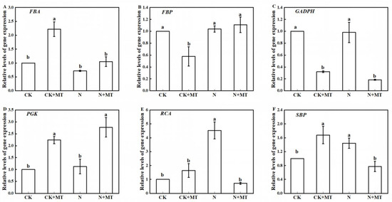 Changes in the expression of transcript levels of six genes affected by MT in the leaves of alkali-stressed tomato seedlings. (A) FBA (fructose-1,6-bisphosphate aldolase gene; (B) FBP (fructose-1,6-bisphosphate esterase gene; (C) GAPDH (3-phosphoglyceraldehyde dehydrogenase gene; (D) PGK (Phosphoglycerate kinase gene; (E) RCA (Rubisco activase gene); and (F) SBP (sedoheptulose-1,7-bisphosphate esterase gene transcripts were quantified by quantitative PCR and measured relative to actin transcripts.