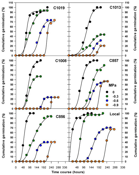Overall, further increases in salt concentration slowed down and depressed germination. At −0.6 MPa, the ‘C1019’ genotype reached 50% germination after 168 h (7 days), and the ‘C857’ and ‘Local’ genotypes germinated to 50% in 192 h (8 days). At the maximum level of salt stress at which seeds germinated (−0.9 MPa), ‘C1019’ and ‘C857’ exhibited the highest tolerance, approaching 50% germination in approximately 200 h (less than 10 days).