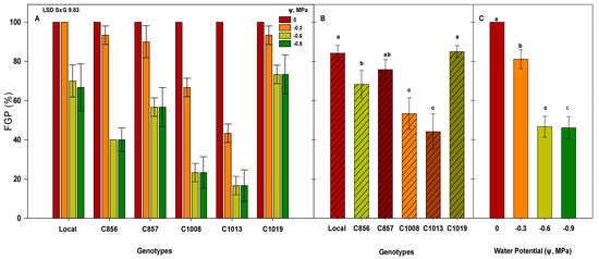 The final seed germination percentage (FGP) was full (100%) under optimal conditions (0 MPa, control) in all the genotypes (Figure 2). The FGP was slightly reduced to 81% at −0.3 MPa, but at lower ψ (−0.6 and −0.9 MPa), the germination decrease was evident (on average to 47 and 46%, respectively).