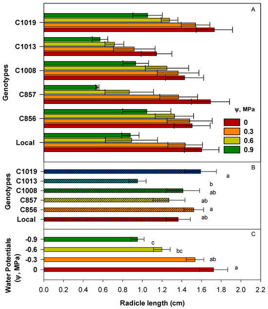 Radicle length (cm) in six genotypes of castor at four different salt levels (0, −0.3, −0.6, −0.9 MPa) (n = 4) (A). Average values are reported per genotype (B) and water potential (C). Values with the same letter are not significantly different at p < 0.05 level. LSD value for S × G (p < 0.05) is reported.