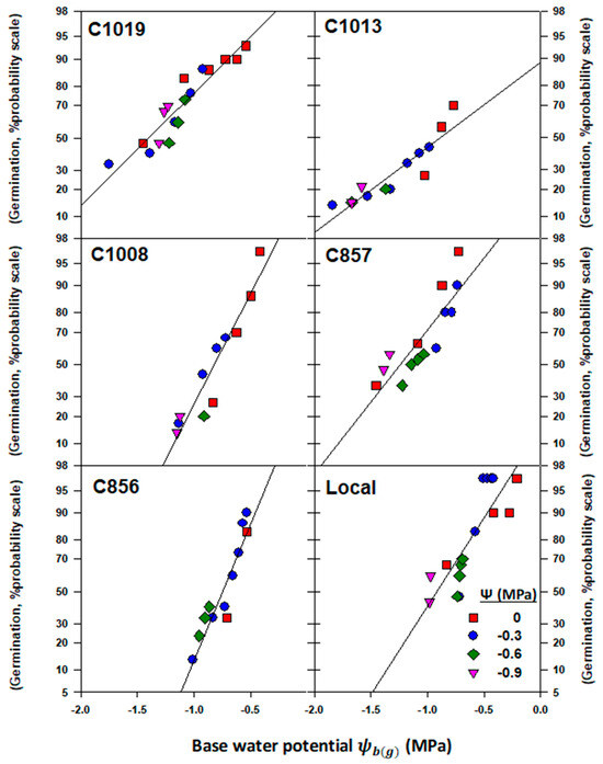 σ is another important parameter of the hydrotime model. It indicates the germination distribution of a seed lot depending on the ψb of each g fraction, i.e., the susceptibility of a given genotype to salt stress during germination. A high value of σ indicates a higher chance of germinating at low (more negative) ψ values. In this regard, the genotypes ‘C856’ and ‘C1008’ had the smallest σ; therefore, their chance to germinate at a low ψ is restricted. On the other hand, ‘C1019’ and ‘C1013’, having a high σ, may better germinate under increasing salt stress conditions.