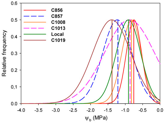 Figure 5 shows how the ψb of each seed lot varies, following a Gaussian distribution. The uniformity of germination is described by σψb, calculated as the inverse of the slope of the fitted line (probit analysis). A wide σψb was calculated for the genotypes ‘C1013’ (0.72) and ‘C1019’ (0.55), both also exhibiting the highest ψb (the least negative).