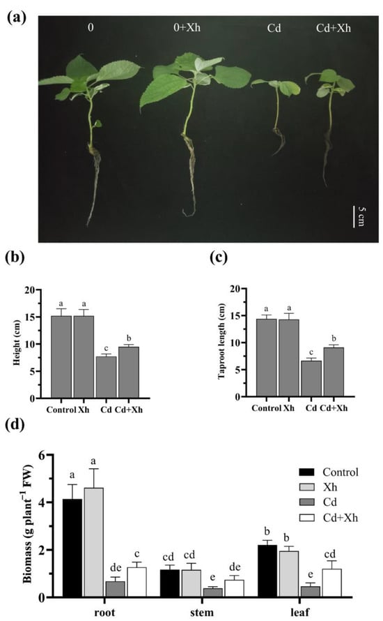 Effect of Xh and/or Cd treatment on the taproot length, plant height, and biomass of ramie: (a) growth performance of ramie; (b) plant height; (c) taproot length; (d) fresh weight of the root, stem, and leaf of ramie. Data are presented as mean ± SD (n = 9). Significant differences at p < 0.05 are indicated by different letters.