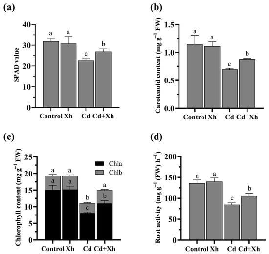 Effect of Xh and/or Cd treatment on (a) SPAD content, (b) carotenoid content, (c) contents of Chla and Chlb, and (d) root activity of ramie. Data are presented as mean ± SD (n = 3). Significant differences at p < 0.05 are indicated by different letters.