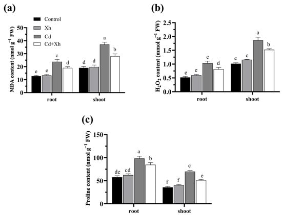 Effect of Xh and/or Cd treatment on (a) MDA content, (b) H2O2 content, and (c) proline content. Data are presented as mean ± SD (n = 3). Significant differences at p < 0.05 are indicated by different letters.