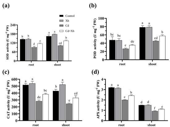 Effect of Xh and/or Cd treatment on the activities of (a) SOD, (b) POD, (c) CAT, and (d) APX in ramie. Data are presented as mean ± SD (n = 3). Significant differences at p < 0.05 are indicated by different letters.