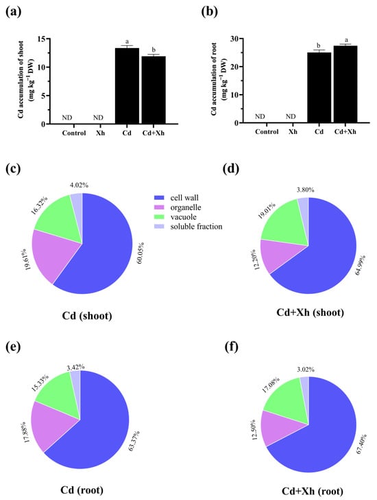 Effect of Xh and/or Cd treatment on Cd distribution in different tissues and cells of ramie. (a,b) the Cd contents of the root and shoot of ramie, respectively. (c,e) the subcellular fractions of Cd in the root and shoot of ramie under Cd stress, respectively. (d,f) are the subcellular fractions of Cd in the root and shoot of ramie under Cd stress after treatment with Xh, respectively. Data are presented as mean ± SD (n = 3). Significant differences at p < 0.05 are indicated by different letters.