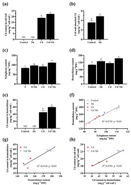 Effect of Xh and/or Cd treatment on the Cd content, hemicellulose content, and Cd content on hemicellulose in the ramie cell wall. (a) Cd concentration in ramie root cell walls; (b) Adsorption capacity of ramie root cell walls grown for 30 days in the presence or absence of xyloglucan incubated with 50 μM CdCl2 for 36 h. (c–e), xyloglucan content, hemicellulose content, and Cd content in hemicellulose of ramie roots under Cd stress for 30 days under control, Xh, Cd, and Cd+Xh treatments, respectively. (f) Correlation between the xyloglucan content and hemicellulose content per ramie plant with and without Cd stress for 30 days in the presence or absence of Xh. (g) Correlation between the hemicellulose content and Cd content in hemicellulose per ramie plant under Cd stress for 30 days in the presence or absence of Xh; (h) Correlation between the Cd content in hemicellulose and cell wall of ramie per plant under Cd stress for 30 days in the presence or absence of Xh. Data are presented as mean ± SD (n = 3). Significant differences at p < 0.05 are indicated by different letters.