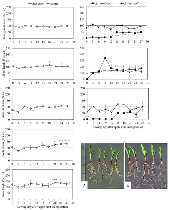 - Karkanis, A.; Alexiou, A.; Katsaros, C.; Petropoulos, S. Allelopathic activity of spearmint (Mentha spicata L.) and peppermint (Mentha × piperita L.) reduces yield, growth, and photosynthetic rate in a succeeding crop of maize (Zea mays L.). Agronomy 2019, 9, 461. [Google Scholar] [CrossRef]