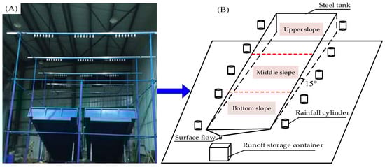 A movable hydraulic lift test trough with slopes ranging from 0 to 30 degrees was used. The steel tanks had dimensions of 4.5 m in length, 2 m in width, and 0.5 m in depth. The rainfall simulator used in the experiments was the NYJL-10 artificial rainfall system (Nanjing Nanlin Electronic Technology Co., Ltd., Nanjing, China, Figure 1). It consisted of 15 sets of nozzles, with each set containing 7 nozzles. Rainfall was simulated from below, with a rainfall height of 6 m, and rainfall intensity ranging from 10 to 240 mm h−1. Through repeated experiments, the effective rainfall area of the system was determined to be 10 × 6 m2, with a rainfall uniformity of ≥88%.