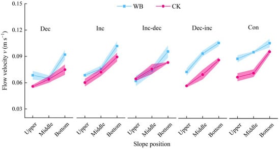 From Figure 3, it can be observed that the variation patterns of v values on the WB and CK are similar at different slope positions. Under the Dec pattern, the lowest average v value on the WB occurs at the middle slope position (0.08 m s−1), whereas the peak value occurs at the lower slope position (0.10 m s−1). For the other rainfall patterns, both WB and CK exhibit an increasing trend in average v values from the upper to the bottom slope position, with increases ranging from 21.21% to 53.39% for the WB and from 28.79% to 51.60% for the CK. This indicates that slope position has a significant impact on runoff velocity under various rainfall patterns.