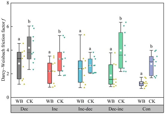 The variation characteristics of Darcy–Weisbach friction factor f under different rainfall patterns. Note: Different lowercase letters indicate significant differences in mean values between WB and CK (p < 0.05).