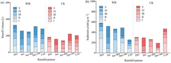 The variation characteristics of total runoff volume (a) and sediment yield (b) under different rainfall patterns: I, II, III, IV, and V represent rain stage I, rain stage II, rain stage III, rain stage IV, and rain stage V, respectively.