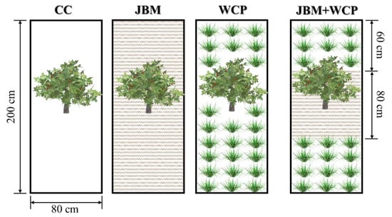 Schematic diagram of experimental treatments layout. CC: clean cultivation; JBM: jujube branch mulching; WCP: white clover planting; JBM + WCP: jujube branch mulching with white clover planting.