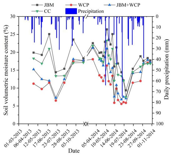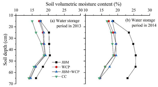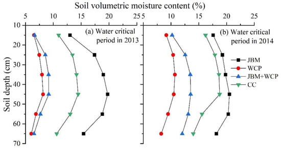 When comparing the soil moisture content in the 0–65 cm layer in May for the same treatment in two experimental years, there was a noticeable difference (Figure 2). In 2014, the soil moisture content of each treatment was obviously higher compared with that in 2013. The average increase was 2.04% for JBM, 4.52% for JBM + WCP, 4.07% for CC, and 2.56% for WCP.