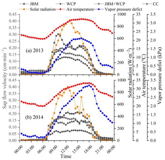 The findings presented in Figure 6 demonstrate that during both experimental years, the diurnal variation curve of the sap flow velocity in each treatment under cloudy conditions exhibited similar patterns and closely corresponded to changes in solar radiation. Throughout the day, it displayed a multi-peak curve pattern while maintaining a relatively stable trend at night. In 2013, sap flow initiation for all four treatments occurred between 06:30 and 07:00 (Figure 6a). However, in 2014, there was a slight delay of approximately 0.5 h in the initiation time of sap flow for each treatment compared with 2013 (Figure 6a,b). Following the initial startup, there was a rapid increase in sap flow velocity. In 2013, the peak sap flow velocity for all treatments was observed around 10:00 (Figure 6a). In 2014, the peak velocity for each treatment occurred approximately 2.0 h later than in 2013 (Figure 6a,b). Subsequently, influenced by various meteorological factors, the sap flow velocity in each treatment displayed a fluctuating downward trend.