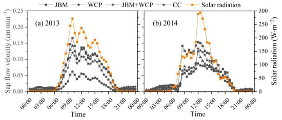 The daily variations of sap flow velocity in jujube tree trunks under different mulching treatments, as well as the daily variations of solar radiation, on cloudy days in (a) 2013 and (b) 2014. CC: clean cultivation; JBM: jujube branch mulching; WCP: white clover planting; JBM + WCP: jujube branch mulching with white clover planting.