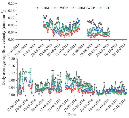 Table 2 provides the indicators that characterized the distinct features of the diurnal variation curves of the jujube stem sap flow velocity for each treatment on sunny and cloudy days during the two experimental years. From the perspective of stem sap flow initiation time, there was not much variation between sunny and cloudy days for the same treatment in 2013. However, in 2014, treatments on sunny days generally exhibited an earlier initiation time by approximately 1.0 h compared with treatments on cloudy days. Under sunny conditions in 2013, the peak time of the sap flow velocity in the four treatments was observed to be 20–40 min earlier compared with that on cloudy days. Additionally, the peak values of sap flow velocity were slightly higher than those observed on cloudy days. The treatments showed an increase in sap flow velocities compared with those observed under cloudy conditions, with respective increases for JBM (21.42%), CC (8.61%), JBM + WCP (31.57%), and WCP (28.42%). In 2014, under sunny conditions, the peak time of the sap flow velocity in each treatment occurred approximately 2.5 h earlier compared with cloudy days. Moreover, the peak values of sap flow velocity were higher than those observed on cloudy days. The treatments demonstrated an increase in sap flow velocities compared with those observed under cloudy conditions, with respective increases for JBM (8.80%), CC (6.89%), JBM + WCP (14.37%), and WCP (10.68%). In both 2013 and 2014, under cloudy conditions, the average daily sap flow velocity in each of the four treatments was lower than that on sunny days. The treatments displayed a decrease in sap flow velocity compared with those observed under sunny conditions, with respective decreases for JBM (48.45% in 2013, 37.54% in 2014), CC (41.94% in 2013, 51.40% in 2014), JBM + WCP (45.59% in 2013, 44.54% in 2014), and WCP (62.51% in 2013, 12.84% in 2014). Under sunny conditions, the rapid decrease in sap flow velocity and the end of transpiration in the four treatments actually occurred later thanthey did on cloudy days.