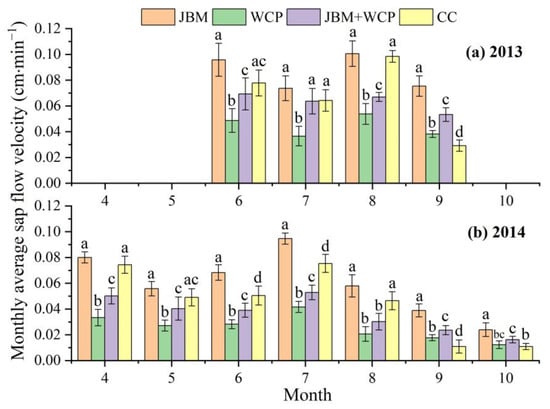 The variation in monthly average sap flow velocities of jujube tree trunks under different mulching treatments during the growing seasons of (a) 2013 and (b) 2014. Different lowercase letters in the same month indicate significant differences in sap flow velocities at the 0.05 significance level. The error bars represent the standard deviation. CC: clean cultivation; JBM: jujube branch mulching; WCP: white clover planting; JBM + WCP: jujube branch mulching with white clover planting.