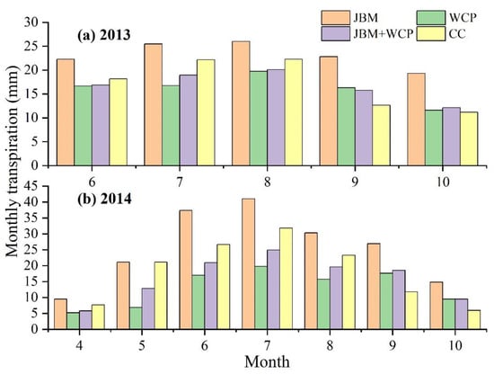 The variations in monthly transpiration water consumption in jujube trees are illustrated in Figure 9. It is evident that over the course of two growing seasons, the transpiration water consumption of jujube trees under different surface mulching measures followed a consistent pattern characterized by an initial sharp increase and subsequent gradual decline (Figure 9a,b). In 2013, the highest transpiration water consumption for all treatments occurred in August (Figure 9a). The JBM treatment showed the highest value (25.84 mm), followed by CC (22.15 mm), JBM + WCP (20.15 mm), and WCP (19.66 mm) (Figure 9a). Conversely, the largest transpiration water consumption among treatments was observed in July 2014, with values of 40.89 mm for JBM, 31.78 mm for CC, 24.88 mm for JBM + WCP, and 19.61 mm for WCP (Figure 9b). Analyzing the total water consumption per plant for the four treatments during different periods, in the period from June to August 2013, the order of water consumption was as follows: JBM (73.42 mm) > CC (62.44 mm) > JBM + WCP (55.92 mm) > WCP (53.08 mm) (Figure 9a). From September to October, the order changed to JBM (41.87 mm) > JBM + WCP (27.62 mm) > WCP (27.60 mm) > CC (23.61 mm) (Figure 9a). In 2014, the total water consumption per plant for the jujube trees exhibited a consistent trend across all treatments. From April to August, the order was JBM (138.64 mm) > CC (110.08 mm) > JBM + WCP (83.59 mm) > WCP (64.07 mm) (Figure 9b). From September to October, the order changed to JBM (41.71 mm) > JBM + WCP (27.80 mm) > WCP (26.79 mm) > CC (17.61 mm) (Figure 9b). In summary, covering the entire soil surface of the jujube orchard with tree branches effectively promoted transpiration in the jujube trees. In the months of June to August 2013 and April to August 2014, both the JBM + WCP and WCP treatments exhibited lower water consumption per individual jujube tree than the CC treatment (Figure 9a,b). Specifically, in 2013, the JBM + WCP treatment showed a 10.45% reduction in water consumption compared with the CC treatment, while the WCP treatment displayed a 14.99% reduction (Figure 9a). Similarly, in 2014, the JBM + WCP treatment demonstrated a 24.07% reduction in water consumption compared with the CC treatment, with the WCP treatment showing an even larger reduction of 41.80% (Figure 9b). To assess the statistical significance, a one-way ANOVA was conducted on the monthly transpiration water consumption of jujube trees under different treatments. The analysis yielded the following results. In 2013, a significant difference (p < 0.05) was observed between the JBM treatment and both the JBM + WCP and CC treatments. Moreover, an extremely significant difference (p < 0.01) was found between the JBM treatment and the WCP treatment. In 2014, an extremely significant difference (p < 0.01) was observed between the JBM treatment and the WCP treatment. Additionally, a significant difference (p < 0.05) was found between the JBM treatment and the JBM + WCP treatment.