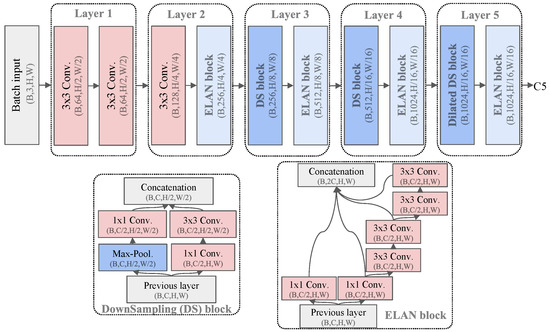 The decomposition of CSPELANNet backbone adopted in the SPVDet. The input images flow through a series of hierarchical downsampling blocks and efficient layer aggregation network (ELAN) blocks, finally yielding the dilated C5 output in a stride of 16 for subsequent analysis.